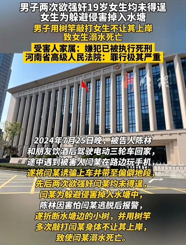 7月的烈日下,河南某水塘边的芦苇依然茂密。这里曾见证一个19岁女孩最后的挣扎--2024年夏天,闫某为躲避性侵跳入水塘,却被凶手陈林用树棍生生阻断生路。时隔一年,当死刑执行通知书终于送到家属手中时,一个更荒诞的现象出现了:疑似凶手的社交账号突然"复活",对受害者家属进行恶毒辱骂。