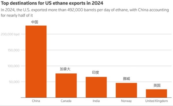 要知道,中国可是美国乙烷的最大买家,2024年美国每天出口的49.2万桶乙烷中,有22.7万桶都卖给了中国。