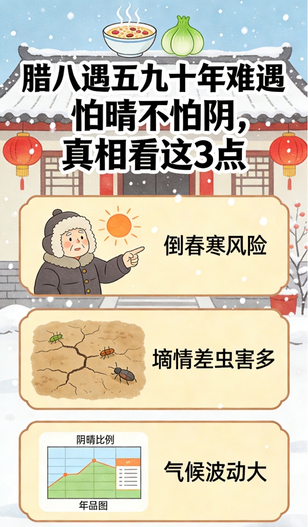 放到现在,这句俗语依然有价值:它提醒我们关注气候异常变化,提前做好应对措施;也让我们敬畏自然规律,明白人类的生产生活离不开对自然的顺应。2026年的腊八虽然特殊,但有现代气象技术的助力,我们不用像古人那样"谈晴色变",而是能科学看待天气变化,从容应对可能出现的风险。