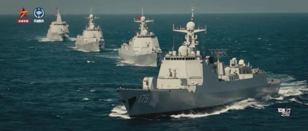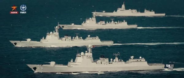 052D、055、护卫舰组成编队,深海航行、协同演练,场面恢弘,尽显大国海军威严。