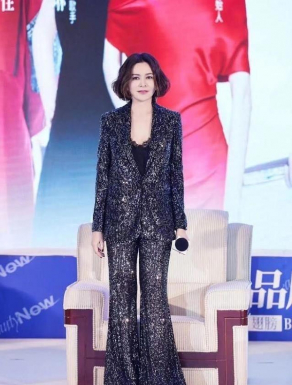 还有那套黑色亮片西装,基本上很多人想到亮片就怕显俗,她居然穿得特别稳。黑亮片西装外套,里面叠蕾丝吊带,锁骨和肩线若隐若现,裤子也是同款亮片,膝盖以下很大气。走动时细闪的光泽,加光线映衬反而低调。没有刻意装年轻,但整个人都带着自信自在的劲头。