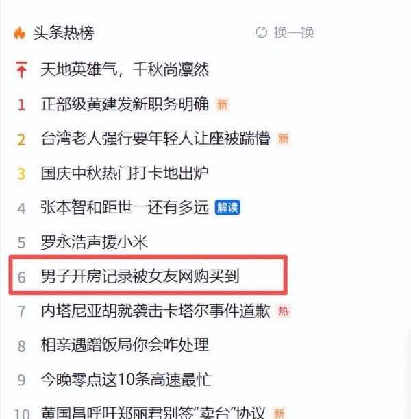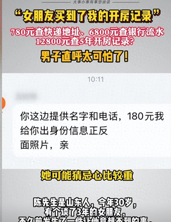 9月30号这桩事,一下子窜到热搜榜第6位:有个男人过去五年的开房记录,被他女友掏出一万二千块买下;还有一次,她又花了780元查出他常用的快递地址,然后拿着这些资料去当面质问他。
