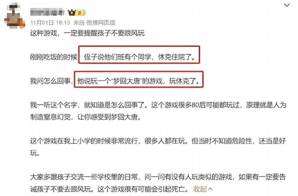 死亡游戏再次现身中小学,家长见到孩子有类似下蹲、憋气、压迫心脏等动作时需要警惕。近日有湖南益阳学生家长爆料称他的孩子在学校内玩一种"梦回大唐"游戏时险些丧命,该家长表示孩子在游戏后会迅速晕倒并伴有尖叫、冒冷汗等症状,直到第二天孩子还有头痛、头晕的症状,该家长呼吁其他孩子家长以及学校老师要时刻警惕这个"游戏"。