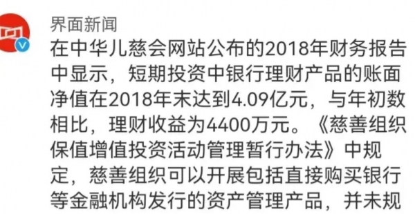根据媒体的爆料,早在2018年,中华儿慈会的账上就有超过4亿的闲置资金。一个慈善机构,竟然有这么多资金,为什么没有捐给有需要的人?其实,这些钱就是通过患者的名义募捐而来的,但是并没有用到她们身上。
