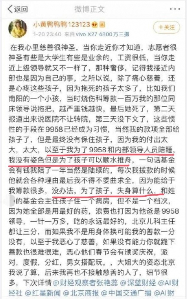 2020年,9958项目为贵州女生吴花燕募捐超100万元,但最后只给到她2万元,其它的钱去哪里了?还不是留在了它们的账户。