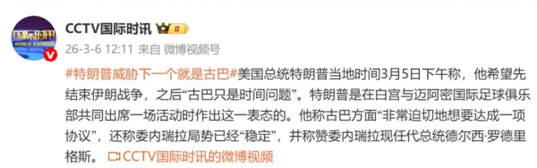 据CCTV国际时讯,当地时间3月5日下午在白宫与迈阿密国际足球俱乐部共同出席一场活动时,美国总统特朗普称,他希望先结束伊朗战争,之后"古巴只是时间问题"。