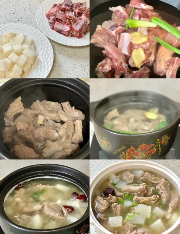 ③排骨捞出来,和白萝卜、生姜一起下锅煮。
