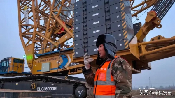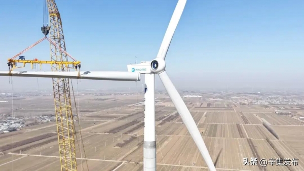 在中建一局河北华电辛集50兆瓦风电项目施工现场,工作人员正操作履带式起重机,精准实施叶片吊装作业;在技术人员的全程精细操控下,巨型叶片被平稳升至百米高空,以毫米级精度缓缓靠向轮毂,最终实现完美对接。