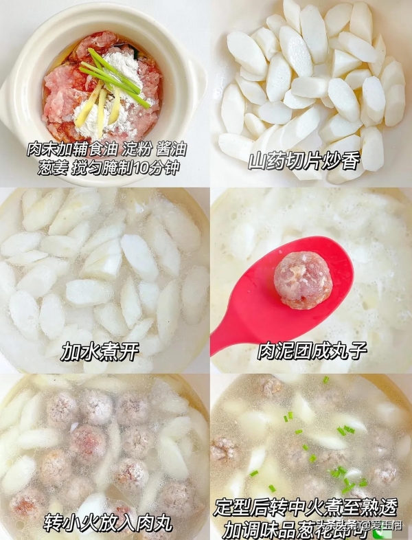 做法:猪肉馅加姜末、葱花、少许淀粉搅匀,搓成小丸子;山药去皮切滚刀块,与丸子同煮,加盐、胡椒粉调味,撒香菜即可。