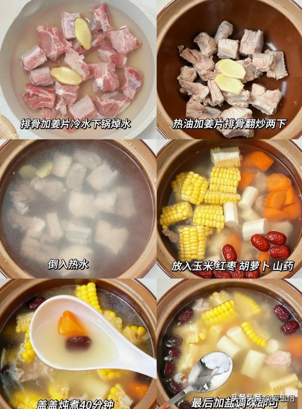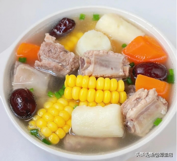 做法:排骨焯水后加姜片煮30分钟,加玉米段、山药块再煮20分钟,加盐调味即可。