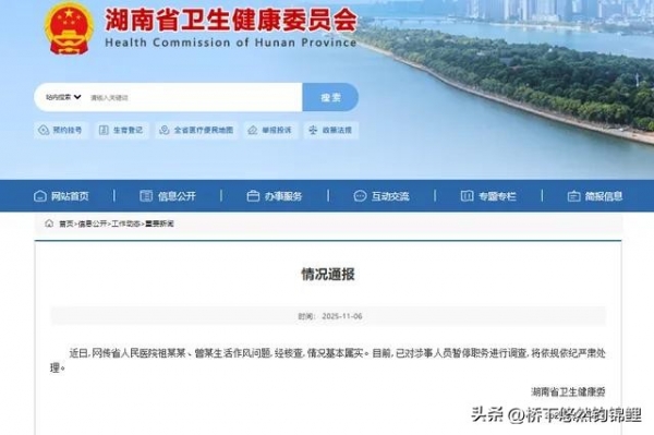 好在官方没藏着掖着。11月6日,湖南省卫健委火速通报:经查,二人生活作风问题基本属实,已双双停职,目前正进一步调查。通报措辞挺严肃--"将依规依纪严肃处理",算是给公众吃了颗定心丸。