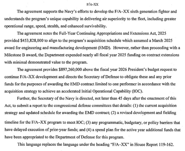 不过 ,在20日早些时候,美国国会参议院拨款委员会公布了2026财年国防拨款法案草案文本,目前正与诸多其他政府机构和部门的支出法案合并审议。与该草案同时发布的还有一份"联合解释性声明报告",包含更多详细信息和国会方面的指导意见。而此前一天众议院拨款委员会则发布了关于该拟议立法更为简略的信息,简要提到了"加大对F/A-XX战机的投资"。