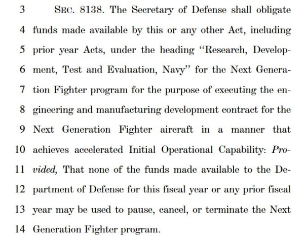 报告还规定,海军部长将在本法案颁布后45天内向国会国防委员会提交一份报告,包括详细说明当前的采购战略和EMD合同的授予时间表、为使F/A-XX项目达到IOC而修订的开发部署时间表、可能导致上年度资金执行延迟的项目预算或者政策障碍,以及该项目拨付给五角大楼的本年度额外资金支出计划。此外该法案草案还明文规定,强制国防部长拨付资金,以"用于加速实现IOC的方式执行下一代战斗机的EMD合同",并禁止将任何指定拨付给F/A-XX的资金用于"暂停、取消或终止"该项目。