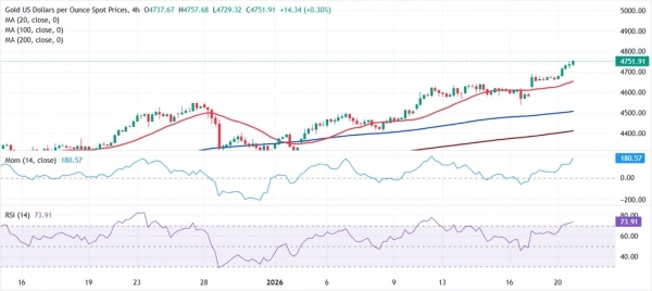 Bednarik指出,从技术角度来看,黄金虽然涨幅过大,但仍处于看涨趋势。在4小时图上,金价位于所有移动平均线上方,20周期简单移动平均线(SMA)高于100周期和200周期简单移动平均线。20周期SMA在4653.79美元/盎司提供动态支撑,100周期SMA在4506.90美元/盎司提供支撑,200周期SMA在4411.78美元/盎司提供支撑。与此同时,相对强弱指数(RSI)保持看涨态势,数值为73,而动量指标也坚定地指向高位,没有出现上涨乏力的迹象。