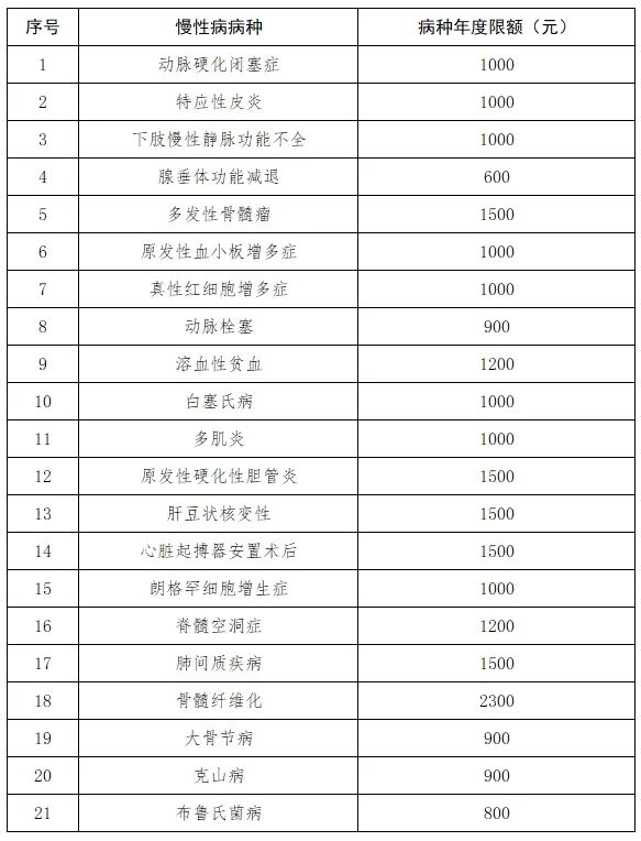 (一)省本级新增门诊慢性病病种。在省本级原57种慢性病基础上增加21种:1.动脉硬化闭塞症、2.特应性皮炎、3.下肢慢性静脉功能不全、4.腺垂体功能减退、5.多发性骨髓瘤、6.原发性血小板增多症、7.真性红细胞增多症、8.动脉栓塞、9.溶血性贫血、10.白塞氏病、11.多肌炎、12.原发性硬化性胆管炎、13.肝豆状核变性、14.心脏起搏器安置术后、15.朗格罕细胞增生症、16.脊髓空洞症、17.肺间质疾病、18.骨髓纤维化、19.大骨节病、20.克山病、21.布鲁氏菌病。