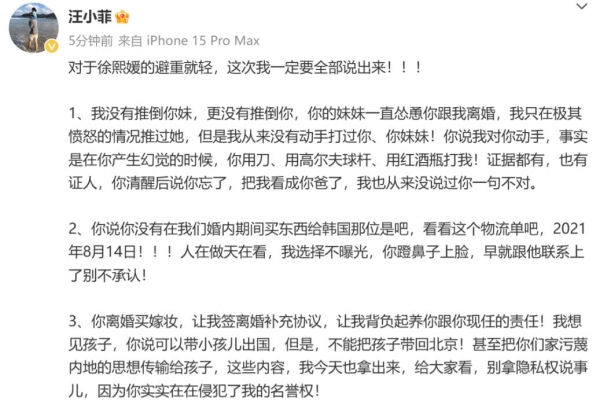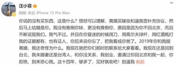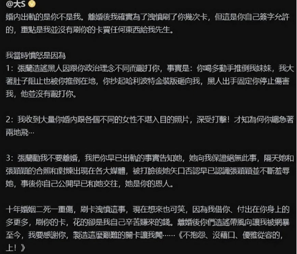 不仅如此,汪小菲在公开离婚的时候也做出了一些令人意外的举动,他直接在社交平台上晒出了一张妻子刷卡买买买的照片,还特别的@了大S,而且在照片的下方,汪小菲还配上了一段话"离婚就离婚,还要挂在我这里,你是想怎么样?"这样的做法也让许多的网友非常的意外,觉得他这样的做法也是十分的无情,毕竟大S也是他的妻子,怎么可以这样的公开挂人呢。