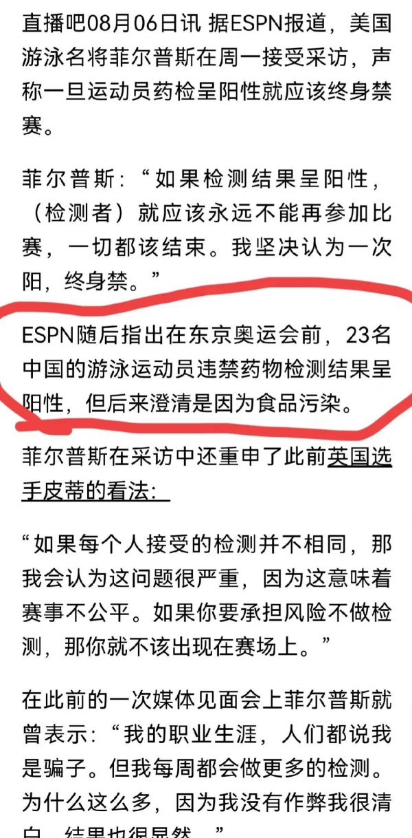 在菲尔普斯发声后不久,ESPN就火上浇油,报道称在东京奥运会期间,有23名中国游泳选手的兴奋剂检测结果呈阳性。
