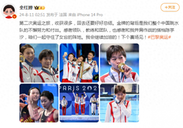 近日,全红婵本人也在社交媒体发文,告别巴黎奥运会。