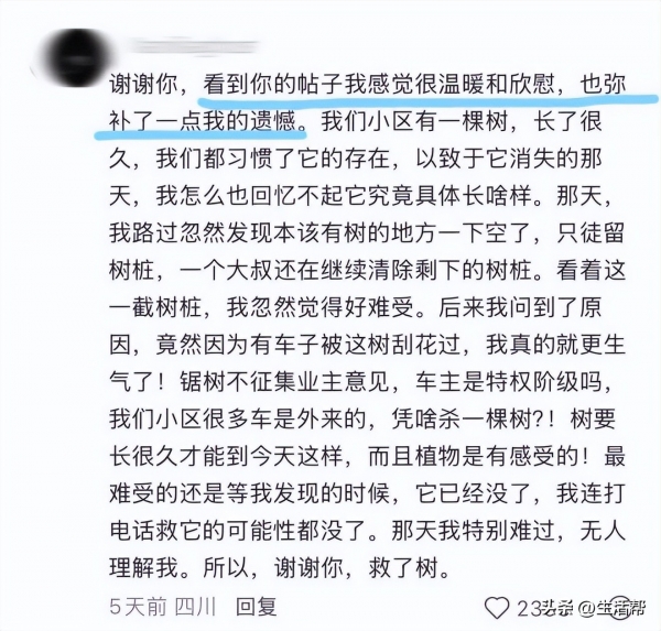 洋洋也完全没想到:"一个小小举动,把我变成了一个'树洞',很多人留言分享他们与花草树木的故事,大家都不知道12345热线还可以救树。"