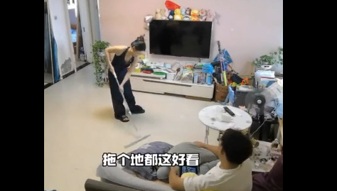 近日,河南,一女生拖地时听到老公的热情旁白,本想摆个美美的造型,结果脚滑了。随后,老公的一个动作瞬间保护住了媳妇。