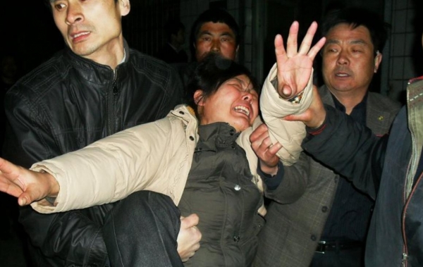 一位妇人哭得伤心无比,望向校领导们的目光也充满了怨念。