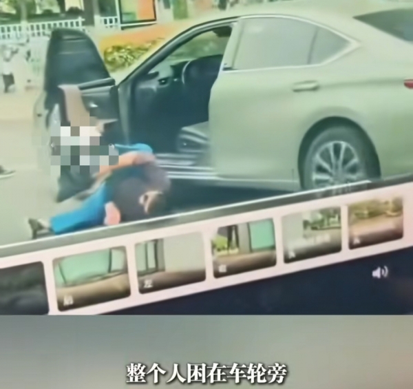 女司机为了停车,她赶紧冲到驾驶位,抢拉手刹,但很遗憾车子把她带倒,拖着她一路滑行!