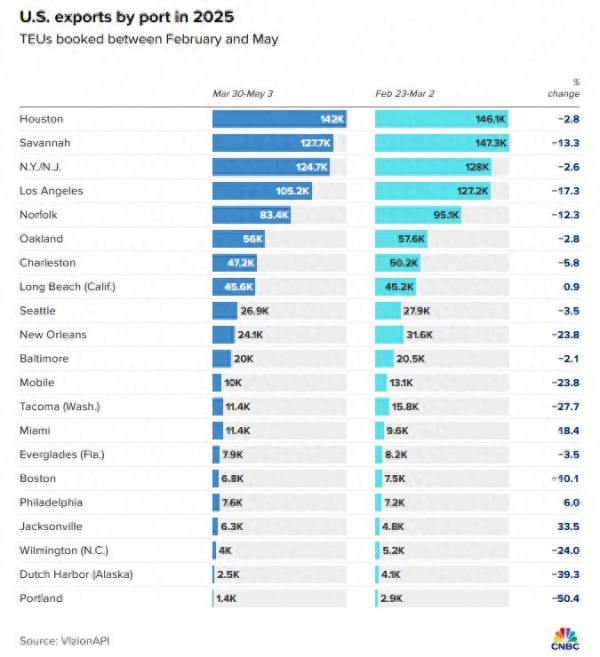 最后是美国国内企业和消费者的强烈呼声。最新数据显示,美国港口集装箱吞吐量同比骤降43%,反映出关税导致的贸易萎缩已进入恶性循环。