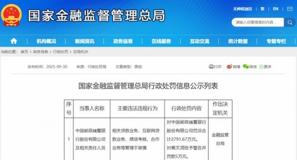 9月30日,国家金融监督管理总局披露相关行政处罚信息,邮储银行因为存在相关贷款业务、互联网贷款业务、绩效考核、合作业务等管理不审慎等多项违规违法行为,被处罚款2791.67万元。