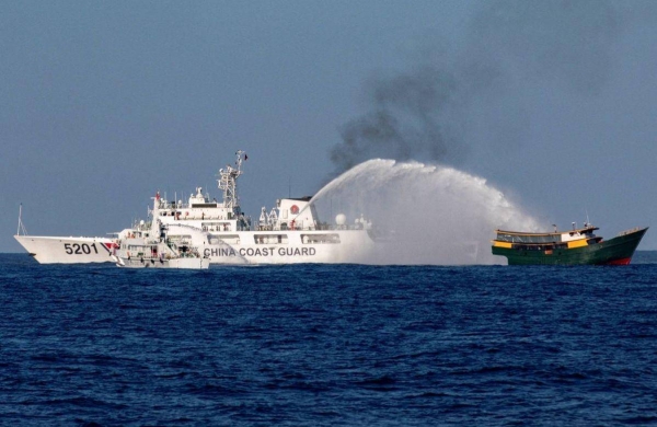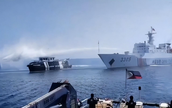 根据中国海警局29日发布消息,8月28日,菲律宾1架H-145型直升机向非法滞留中国仙宾礁的菲海警9701号船空投物资,中方全程跟监、依规处置。菲方冒险行径,极易造成海空不测事件。