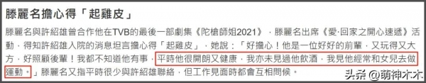 也是没想到几周后就会传出他病危的消息,滕丽名此前受访都感到很吃惊,说平时看着他开朗又健康,也没见过他喝酒,还经常和女儿去做运动。听上去许绍雄平日里也非常注重养生。