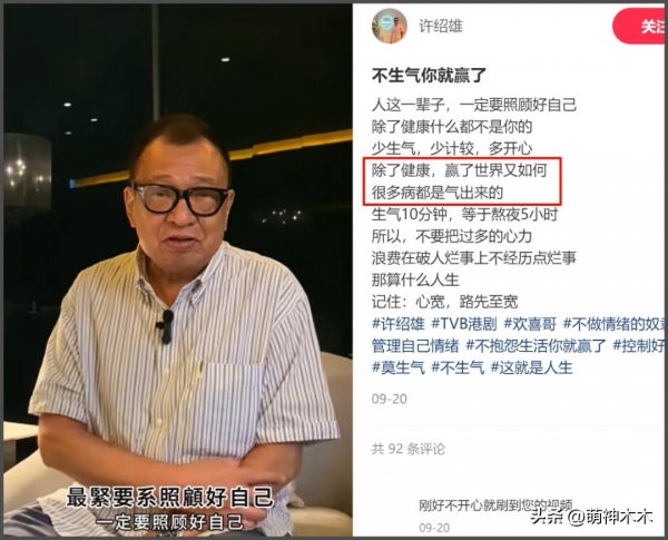 还曾在9月份和网友分享人生,告诉网友不要生气,"除了健康,赢了世界又如何"。