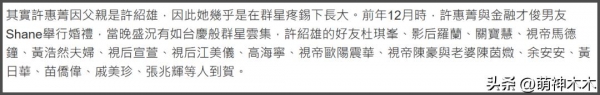 许惠菁和男友Shane结婚时,许绍雄更是送上位于新加坡价值2300万元的物业,来宾也基本上全是港圈大咖,影帝视后云集,看得出来许绍雄混圈这么多年,人缘确实很不错。