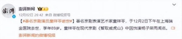 而后著名的老戏骨智娶威虎山杨子荣的扮演者"童祥苓"老先生,在12月2日下午,在上海的瑞金医院内去世,这一消息让人悲痛万分,看着老戏骨一个个离去,属实让人心痛。