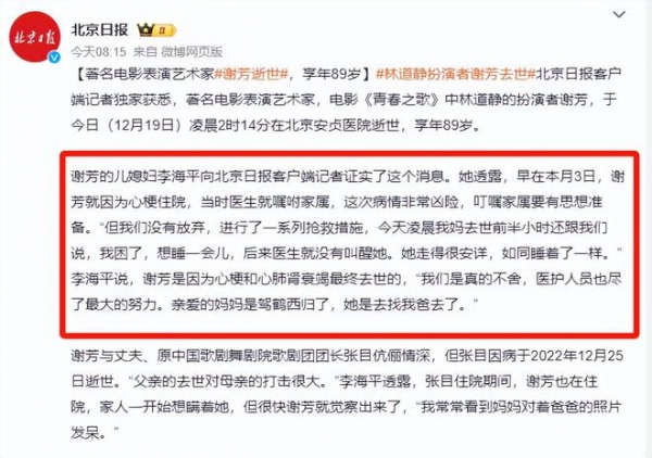 后来医生并没有叫醒谢芳奶奶,谢奶奶走的时候非常安详,如同睡着了一样,看到这个消息,真的让人悲痛万分。