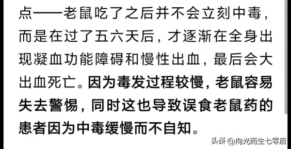 这种毒一开始并不明显,过程很慢,老鼠还需要五六天才出现慢性出血。所以人类误食后更是很久而不自知。