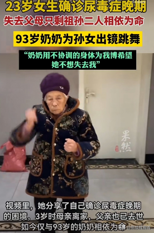 贵州93岁老人对着镜头摇晃身体,胳膊甩得歪歪扭扭,腿脚挪着小碎步,镜头那头是她23岁的孙女,孙女躺在透析床上,盯着屏幕掉眼泪,这个画面被发到网上,看哭的人一堆,骂人的人也不少。