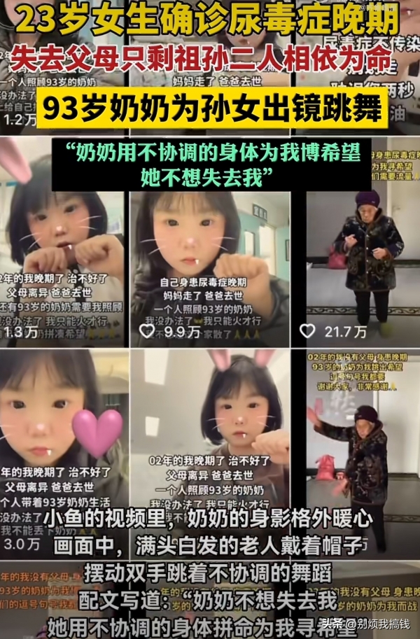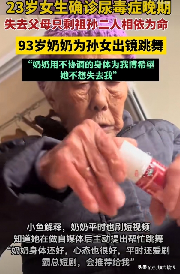 奶奶知道孙女的心思,孙女想攒钱做肾移植手术,那手术要花几十万,不是小数目。奶奶没什么本事,就想着帮孙女多挣点关注度,她主动提出要拍跳舞视频,老人头发全白了,戴着顶旧帽子,动作不协调,手脚都不太听使唤,可每一下都用了劲,小鱼给视频配的文字很简单,奶奶不想失去我,她用不协调的身体拼命为我寻希望。奶奶平时爱刷短视频,还爱看霸总短剧,刷到有意思的就喊孙女一起看,她觉得这样能让孙女开心点,能暂时忘了身上的疼。