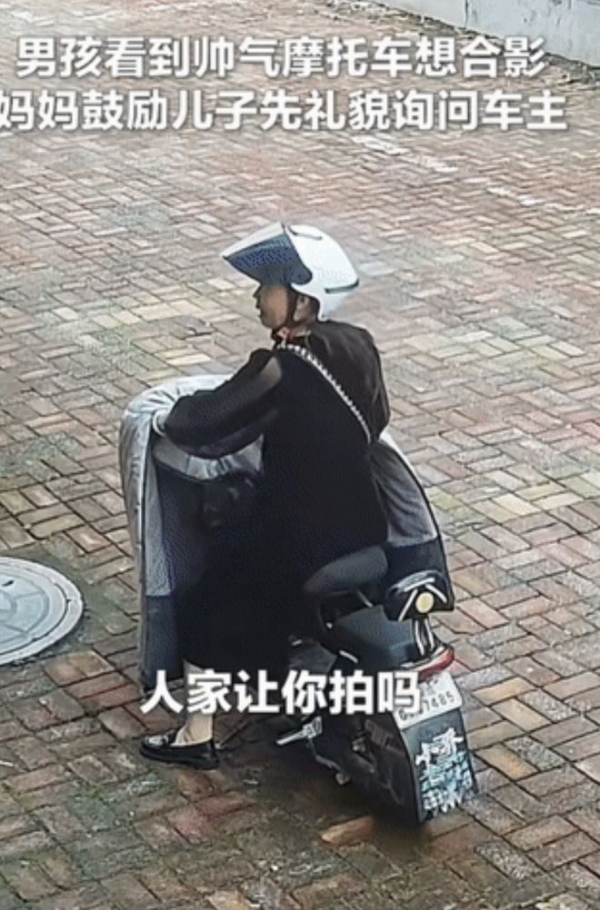孩子高兴地围着摩托车,留下自己喜欢的画面。妈妈站在一旁,用手机记录下这个瞬间