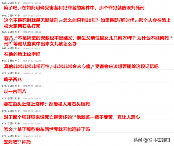 韩国网友们也愤怒地表示:"这种狗东西就要剁掉他的辣椒啊"、"求求你了,把这种不能称之为人的东西处死吧"、"即使被判了死刑我也觉得受害者可怜"、"监狱里的饭都不想给他吃,让他在监狱里干活干到死吧"、"想要把'强奸亲生女儿'这几个字烙在他的额头上"、"看了这期节目,真的一直在飙脏话,那个禽兽和女儿说自己不仅是她的父亲,还是她的恋人"……