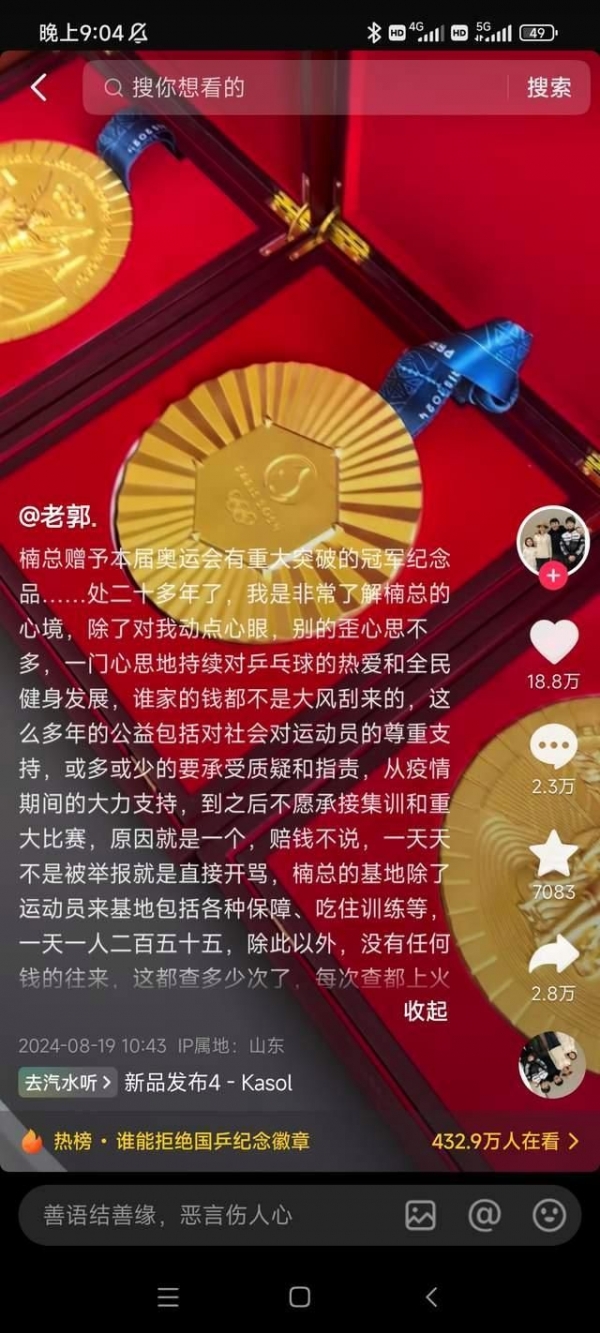 前不久,王楠老公郭斌,发了条小视频并配了一段小作文,表示奖励孙颖莎、王楚钦以及马龙的三枚黄金打造的金牌,已经准备好了,一时间,引起了很大的热议。