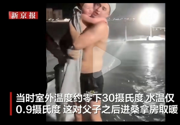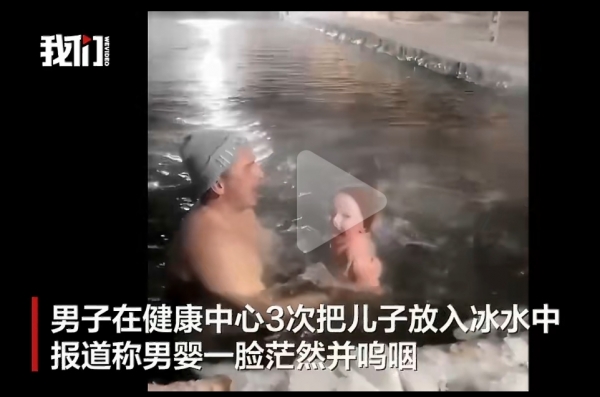 画面中,1岁男婴在接近零度的冰水中一脸茫然,发出呜咽声,而他的父亲却表情坚定。短暂浸泡后,这对父子进入了桑拿房取暖。健康中心老板不仅全程记录,还特意为这名婴儿颁发了一枚奖章,称他的脸上"充满了对爸爸的喜悦和信任"。
