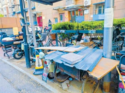 以1号楼北侧的充电车棚为例,车棚里一辆旧三轮车格外显眼。车上拴着大铁链,铁链另一头拴着一架人字梯,一把U型锁又把人字梯锁在了车棚的立柱上,这一套复杂的"九连环"下来,不仅占用空间大,还至少"隔离"了四个充电插口,电动自行车根本无法靠近充电桩。