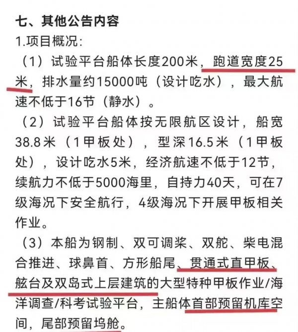 关于该舰的实际用途,美媒提出了几种推测。首先,根据"战区"文章和网络上一份2022年发布的招标信息,这艘舰艇很可能是一艘用于海洋研究和海试用途的"大型特种甲板作业船"。根据这份招标文件显示,要求舰船为"贯通式直甲板",采用"双岛"上层建筑,具备宽敞的飞行甲板和机库空间,还预留了船尾的坞舱,能够搭载无人机、载人直升机等多种飞行器,具备多样化任务执行能力。