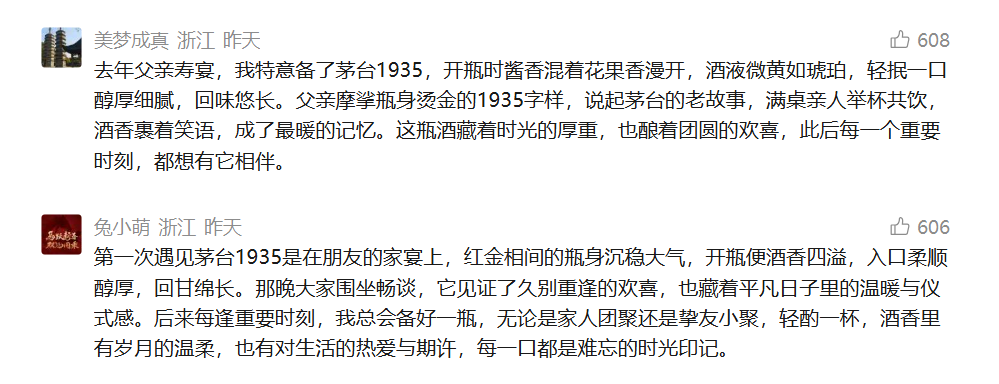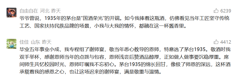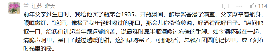 在评论区,还有不少故事藏着岁月的沉淀与亲情的重量。北京网友"张三岁"直言,茅台1935就是年味的代名词,团圆时开一瓶便能让满屋子都是熟悉的酱香,家人围坐唠嗑、吃饭、碰杯,简单又踏实,喝的是味道,更是团圆的氛围与对新一年的期盼。江苏网友"兰"则回忆起父亲过生日的场景,她给父亲买了瓶茅台1935,开瓶瞬间醇厚酱香漫了满室,父亲摩挲着瓶身眼眶微红:"那会儿你爷爷总说,好酒得配好日子。" 席间父亲抿一口,讲起当年跑运输的苦,如今酒杯碰在一起的清脆声响里,是日子越过越暖的甜。