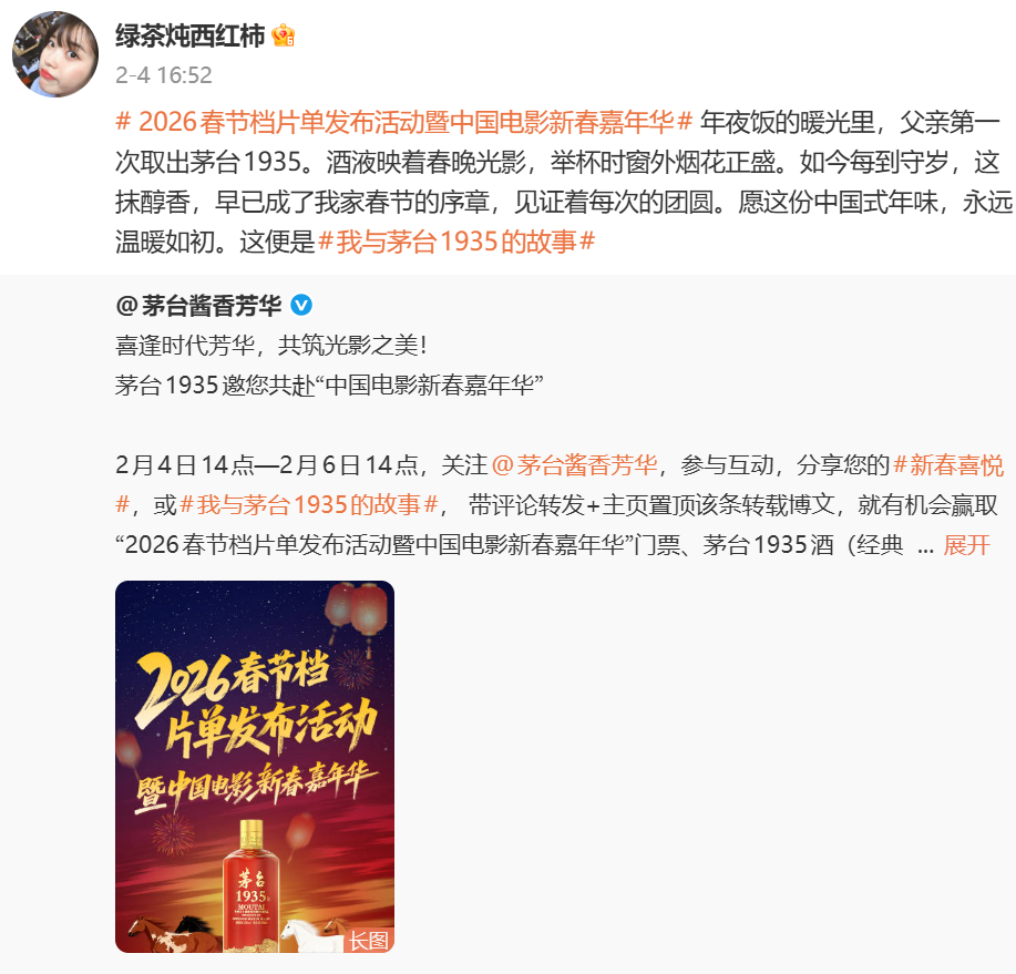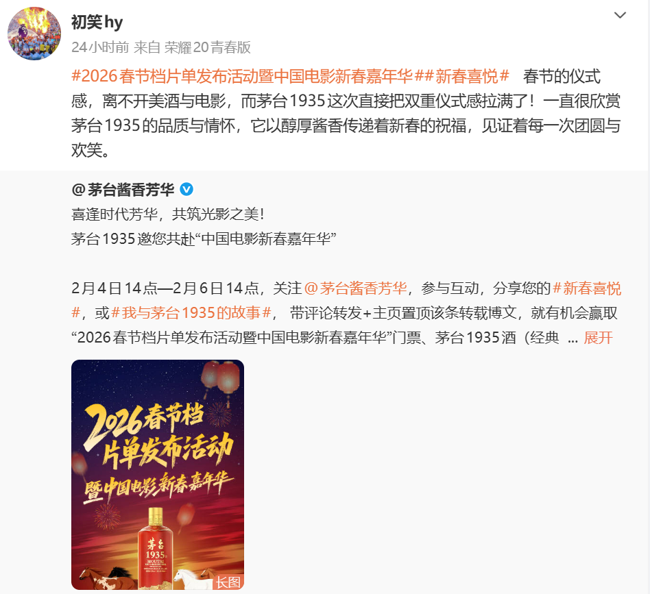 此前,茅台1935为广大影迷与酒友带来了重磅福利,参与活动即有机会赢取2026春节档片单发布活动的门票、茅台1935经典酒款及周边好礼。