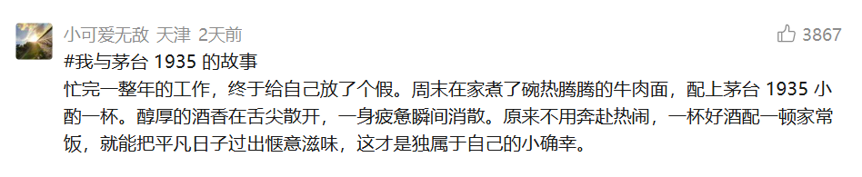 同样在异乡过年的天津网友"小可爱无敌",则在文字里藏着一份独属于自己的小确幸。忙完一整年的工作,他终于给自己放了个假,没有奔赴热闹的新春现场,而是周末在家煮了碗热腾腾的牛肉面,配上茅台1935小酌一杯。醇厚的酒香在舌尖散开,一身疲惫瞬间消散。原来不用扎堆喧嚣,一杯好酒配一顿家常饭,就能把平凡日子过出惬意滋味,让孤独的春节有了别样的温暖与慰藉。