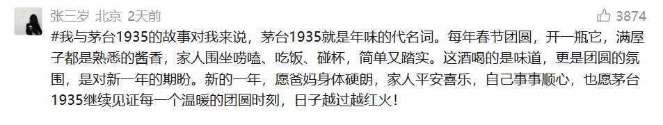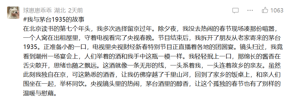 电影是时光的馈赠,而茅台1935则是新春记忆里的温情符号。在此次活动的评论区,许多网友分享了自己与茅台1935的新春故事,每一段文字都饱含真情,让人感受到浓浓的年味与团圆的温暖。