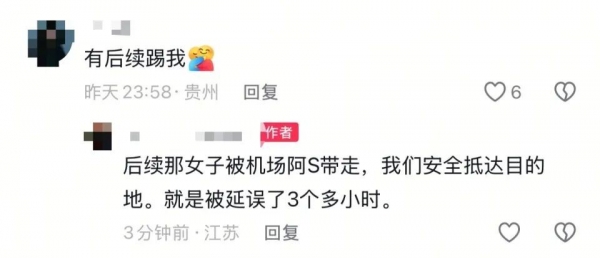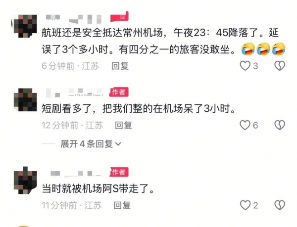 评论区中,发布者称,晚上11时45分,航班安全抵达常州机场,耽误了3个多小时,有四分之一旅客没敢坐,"涉事女子当场就被警方带走了。"
