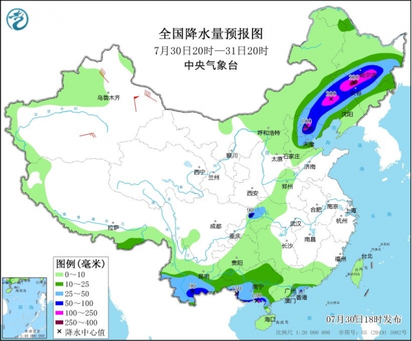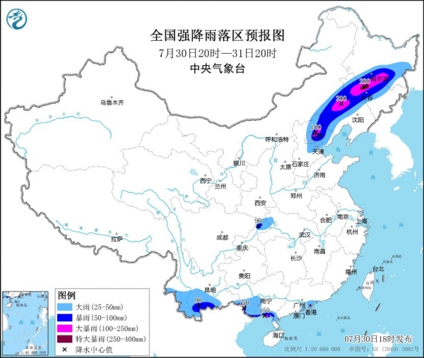中央气象台7月30日18时继续发布暴雨橙色预警和强对流天气黄色预警。7月30日20时至31日20时,内蒙古东南部、黑龙江南部、吉林中西部、辽宁中西部、北京、天津、河北东北部、重庆北部、云南西南部、广西南部等地部分地区有大到暴雨,其中内蒙古东南部、黑龙江东南部、吉林中西部、河北东北部、北京东北部、广西南部等地部分地区有大暴雨,吉林中部等地局地特大暴雨(250~280毫米),上述部分地区伴有短时强降水(最大小时降雨量20~50毫米,局地可超过80毫米)(见图1)。内蒙古中东部、东北地区中南部和西北部、华北北部、江汉北部、黄淮西部等地的部分地区将有8级以上雷暴大风或冰雹天气,其中,吉林中北部、辽宁北部、河北东北部等地的部分地区将有10级以上雷暴大风,最大风力可达11级以上。