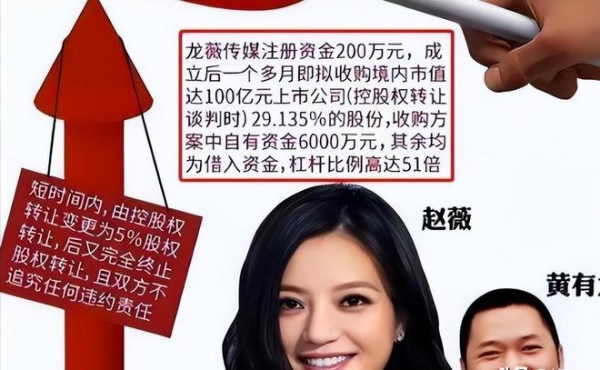 2016年,赵薇企图用注册资本仅200万的龙薇传媒收购万家文化29.13%,收购资金30.6亿元,其中只有6000万是自有的,其他全靠借贷。